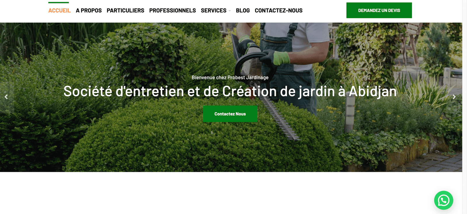 PROBEST JARDINAGE est une société de jardinage basée en Côte d’Ivoire, plus précisément à Abidjan, et intervient dans les différents travaux de jardinage sur l’ensemble du territoire national. Forte de plus de 10 ans d’expérience, elle se positionne comme l’un des prestataires les plus expérimentés du marché local.